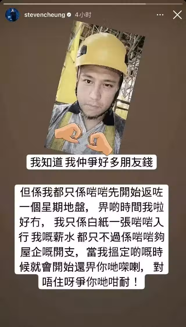 此前張致恆也在自己的社交平台上公開表示,他所欠下的外債會逐步還給當事人,但是現階段他做地盤工沒有很久,收入也不是特別穩定,加上手頭沒那麼寬裕,所以還需要一些時間,眼見他有此改變,想來不少喜歡張致恆的粉絲還是比較欣慰的。