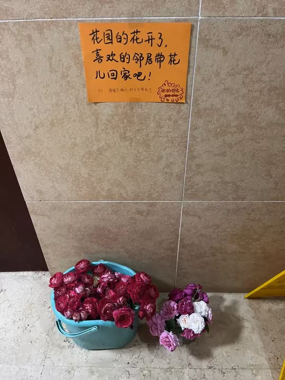 原PO在小紅書貼出照片,並表示某天下班回家,搭電梯前卻發現走廊上有個桶子裝滿了漂亮花朵,牆壁上更貼了一張紙條寫著「花園的花開了,喜歡的鄰居帶花回家吧!」收到這樣的禮物,原PO不禁讚嘆對方是神仙鄰居,同時也感動地說:「看到花的這一刻真的瞬間掃除了一天上班的疲憊,開心地帶走了一朵。」她也不忘寫紙條感謝鄰居,「謝謝你的花,很喜歡!」。