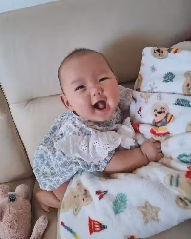 照片中,五個月大的Beryl神複製洪永城的單眼皮小眼睛,父親的遺傳基因超級強大! Beryl亦非常愛笑,笑起來的時候與笑佛有幾分神似。