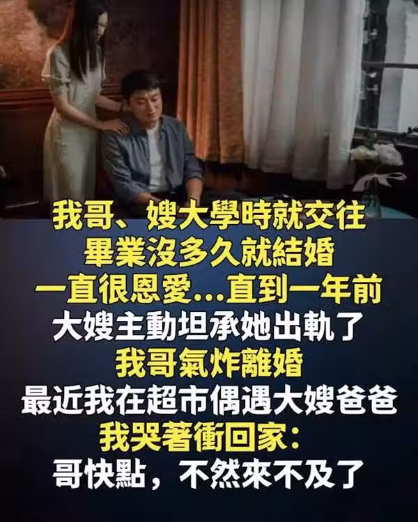 我哥、嫂大學時就交往,畢業沒多久就結婚一直很恩愛.... 直到一年前「大嫂主動坦承她出軌了」我哥氣炸失婚,最近我「在超市偶遇大嫂爸爸」我哭著沖回家:哥快點,不然來不及了!