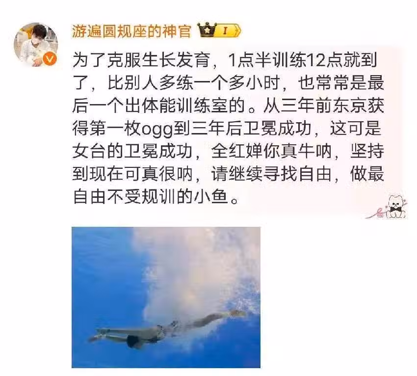 全紅嬋表示自己一度懷疑過自己,動作一直提升不上去,最後通過自己的意志努力,慢慢提了上去。
