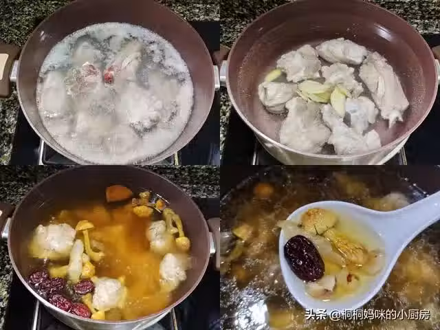 4、然後倒入湯料(姬松茸、玉竹、蓮子、桂圓、紅棗、陳皮1小塊),湯煮開後轉小火熬煮一個半小時。