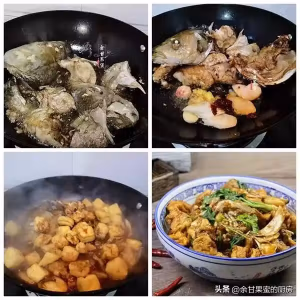 豆腐果燉魚頭:豆腐果、魚頭、姜、蔥、糖、鹽、料酒、醬油、黃豆醬、食用油。