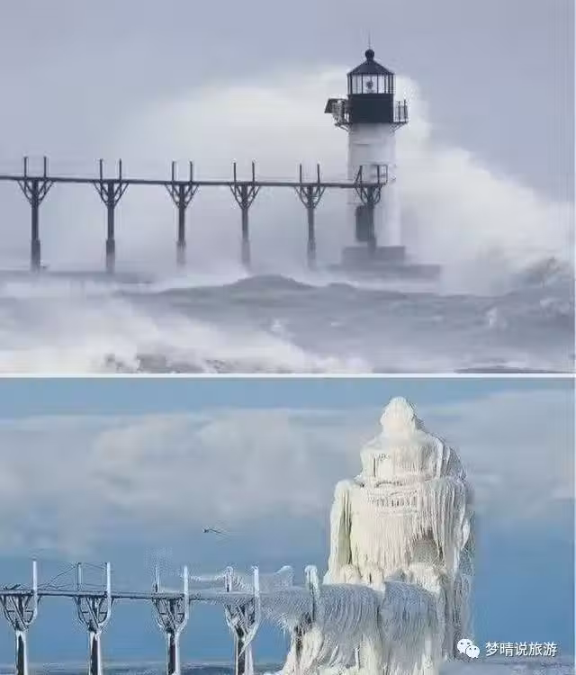 把時間凝固在這一刻。第十四張:深冬的一場大型風暴過後,海上的燈塔變成了冰塔……。大自然的魔力就像一位雕塑家,用冰雕成了一座冰之宮殿。