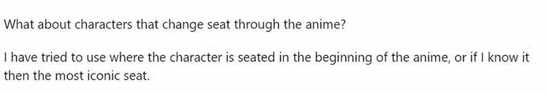 「這種『教室左後方靠窗』的刻板印象說起來也滿荒謬的,竟然有三分之一的動畫主角,就集中在那兩個位置。」