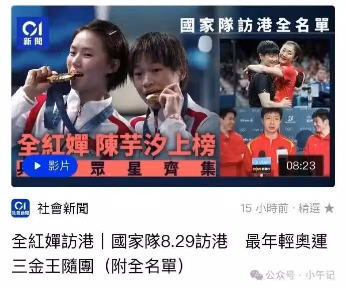 8月24日,港媒忽然發布頭版頭條,稱《國家隊8.29訪港,最年輕奧運三金王隨團》。封面上放的也都是大熱的運動員,小圖里放了陳夢孫穎莎擁抱的畫面,還有馬龍樊振東和王楚欽接受採訪的畫面。但最大的封面則是留給全紅嬋陳芋汐的,就連標題前面都寫著「全紅嬋訪港」。