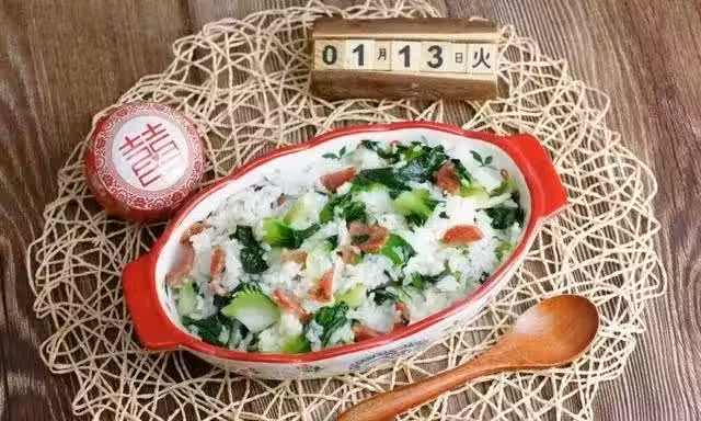 5. 待米飯還剩10分鐘煮熟時,加入香腸和小青菜,用飯勺攪拌均勻,再燜煮10分鐘