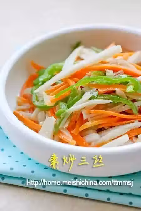 4.然後下入胡蘿蔔絲和藕絲大火爆炒,然後下入一小勺鹽、一小勺白醋,炒至微微出水時,下入少量味精、胡椒粉調味,翻炒均勻即可出鍋。