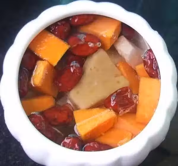 材料:南瓜半個、山藥半條、紅棗5顆、 細砂糖1.5大匙、水600cc