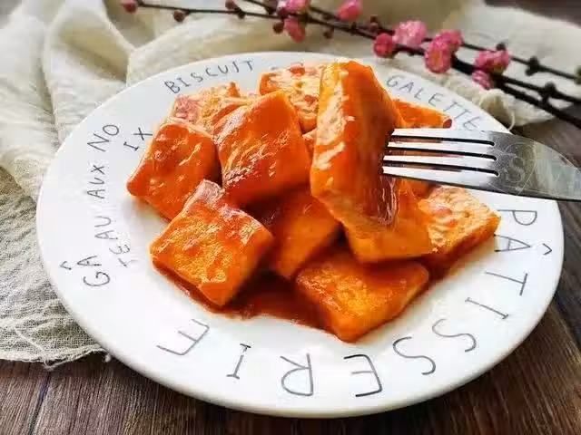 1、老豆腐切成1厘米厚的小方塊,糖醋汁請按照個人口味調製