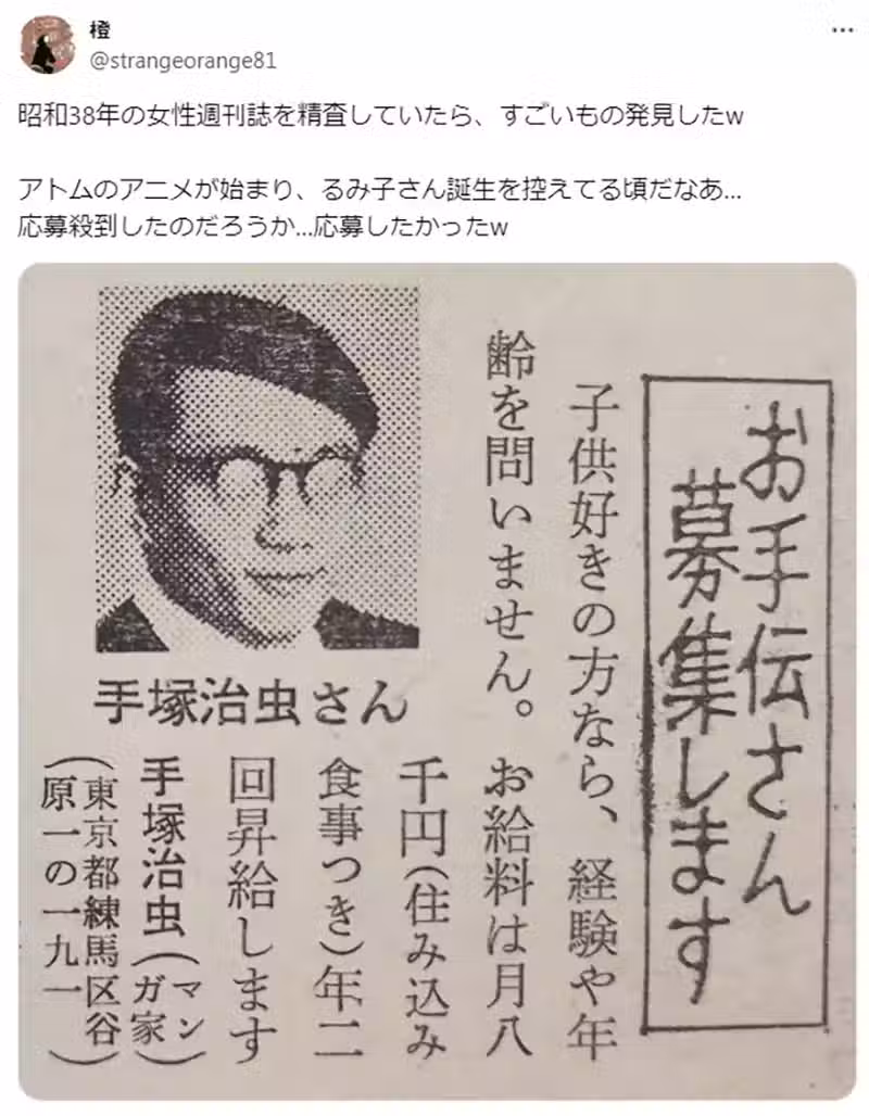 《手塚治虫徵人廣告》月薪8千日圓供吃住,動漫迷們搶著要應徵幫傭了