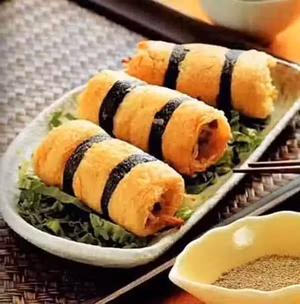 4、紫菜條面端沾少許麵糊,裹住豆包卷(每卷裹兩條紫菜),入油鍋小火煎熟即可。