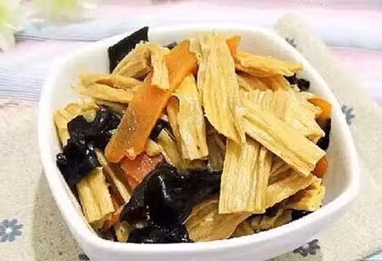 1、木耳、腐竹泡發,胡蘿蔔洗凈;