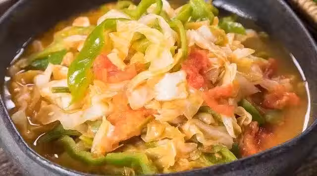3. 加入捲心菜和青椒炒軟,加蔬果粉和鹽調味即可出鍋。