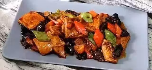 1.千葉豆腐用水沖洗一下切片,青紅椒切小塊。