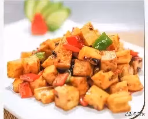 1、青紅椒去蒂去籽洗凈後切成丁,豆腐乾切丁,蓮藕去皮洗凈後切丁