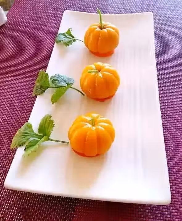 3、最後插一小截香菜梗在上面做成南瓜的柄;