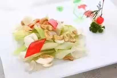 特點:此菜三色相間,芹菜脆嫩,百合軟爛,腰豆咸香。