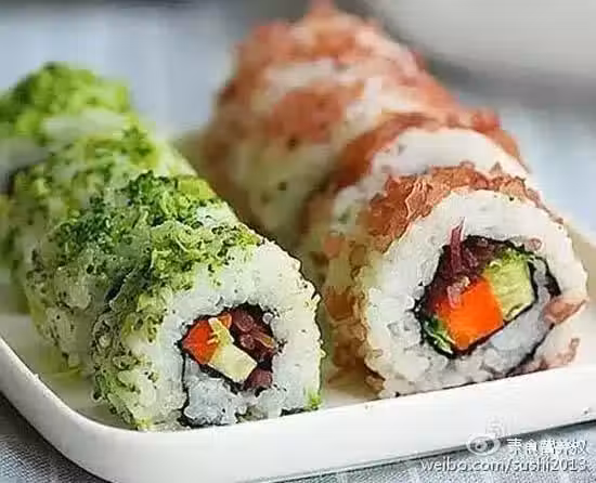 7、內卷:海苔上鋪一層米飯,放上胡蘿蔔、黃瓜、西蘭花碎、血珊瑚草,捲起即可,吃的時候沾壽司醬油。