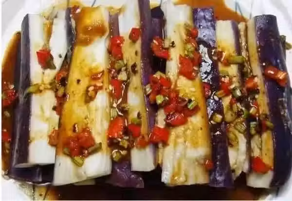 3、將茄子放入蒸鍋中蒸熟用筷子扎感覺裡面軟就可以。將茄子排在盤中淋上調好的味汁即可。