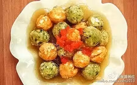 4、兩種糊分別團成小丸子,炒鍋加水燒開,丸子下鍋汆熟,盛放到盤子裡。