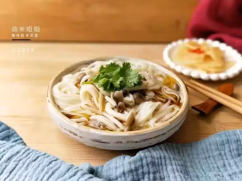 蟹味菇50克,麵條80克,蔬果粉少許,生抽1勺,白醋半勺,芝麻油1勺,香菜少許