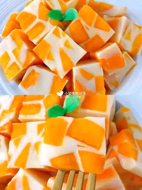 3. 然後倒入芒果模具里拌勻,放冰箱冷藏2個小時以上至凝固。取出脫模切塊即可~