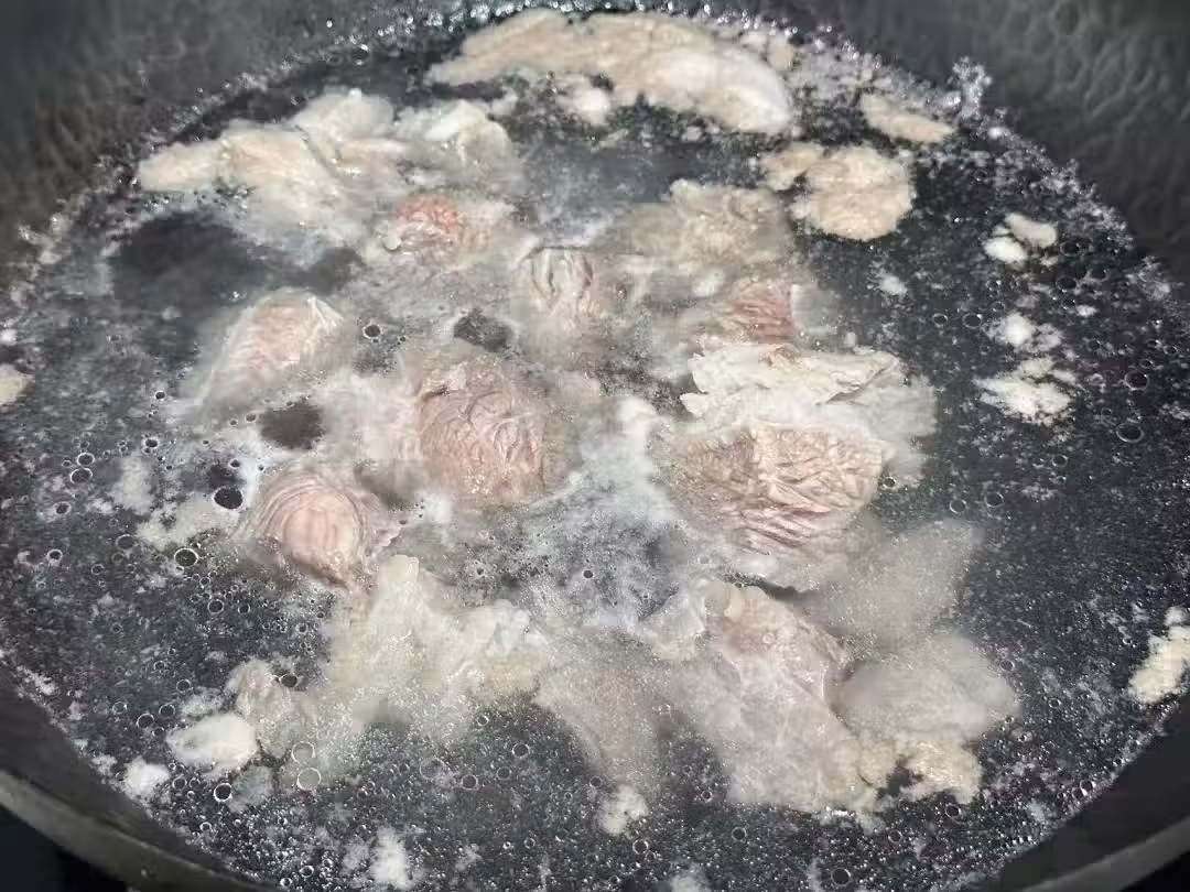2、冷油冷鍋,下入冰糖炒個糖色,下入焯水的牛腩,翻炒至上色,加入生薑片和八角,把肉推到一邊,下入去皮的一半番茄,炒出湯汁。