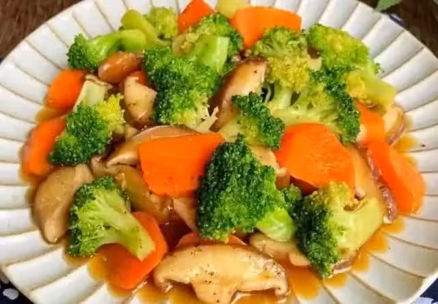 3、放入西蘭花,胡蘿蔔翻炒,加一勺生抽,一勺耗油,黑胡椒翻炒均勻即可。
