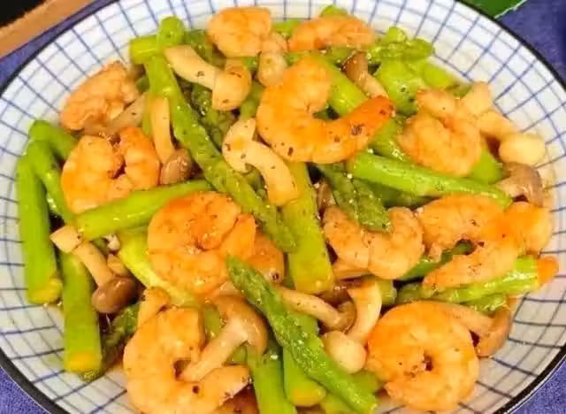 2、蘆筍焯水撈出,油熱放入家人翻炒變色裝盤,蔥姜爆香,菌菇翻炒至軟,放蘆筍,蝦仁加一勺生抽,一勺耗油,適量鮮蔬粉和黑胡椒,翻炒均勻即可出鍋。