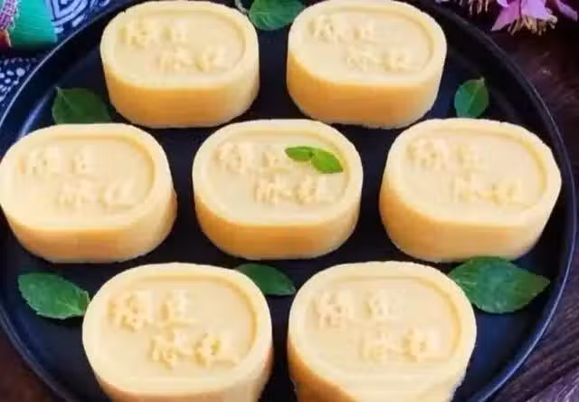 3、再將綠豆沙搓成50克一個的小糰子,搓勻後放入模具中壓出形狀即可。