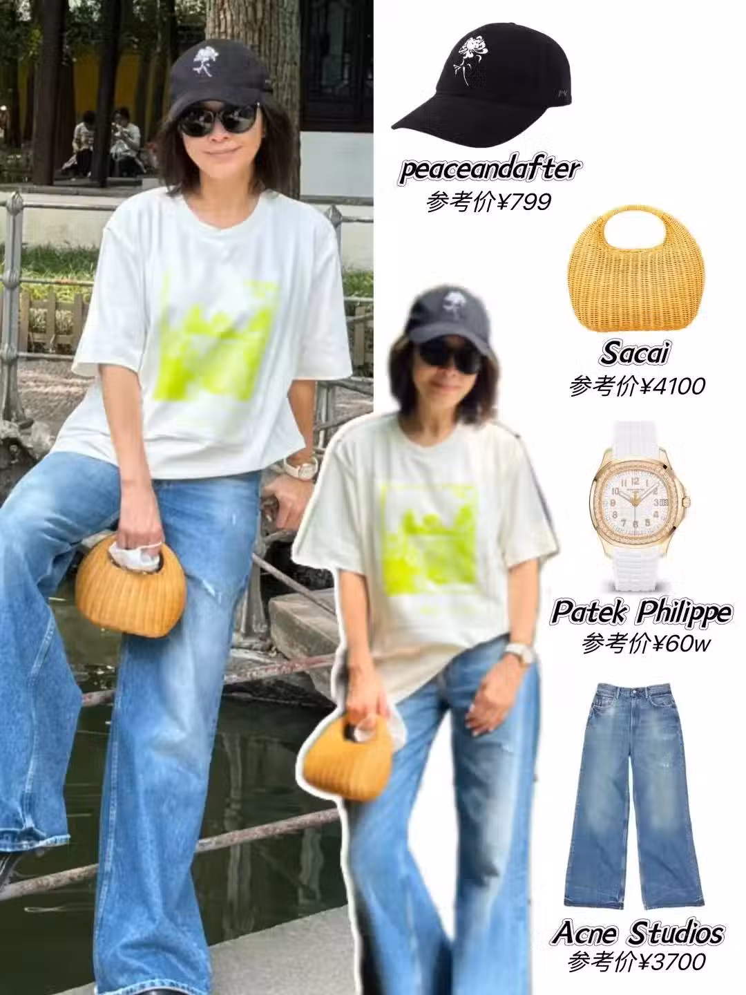 有相關人士扒出劉嘉玲一身的價格,原來那款包包不算太貴,4000齣頭,反倒是看上去很普通的牛仔褲,竟要3700元,帽子也要799元。