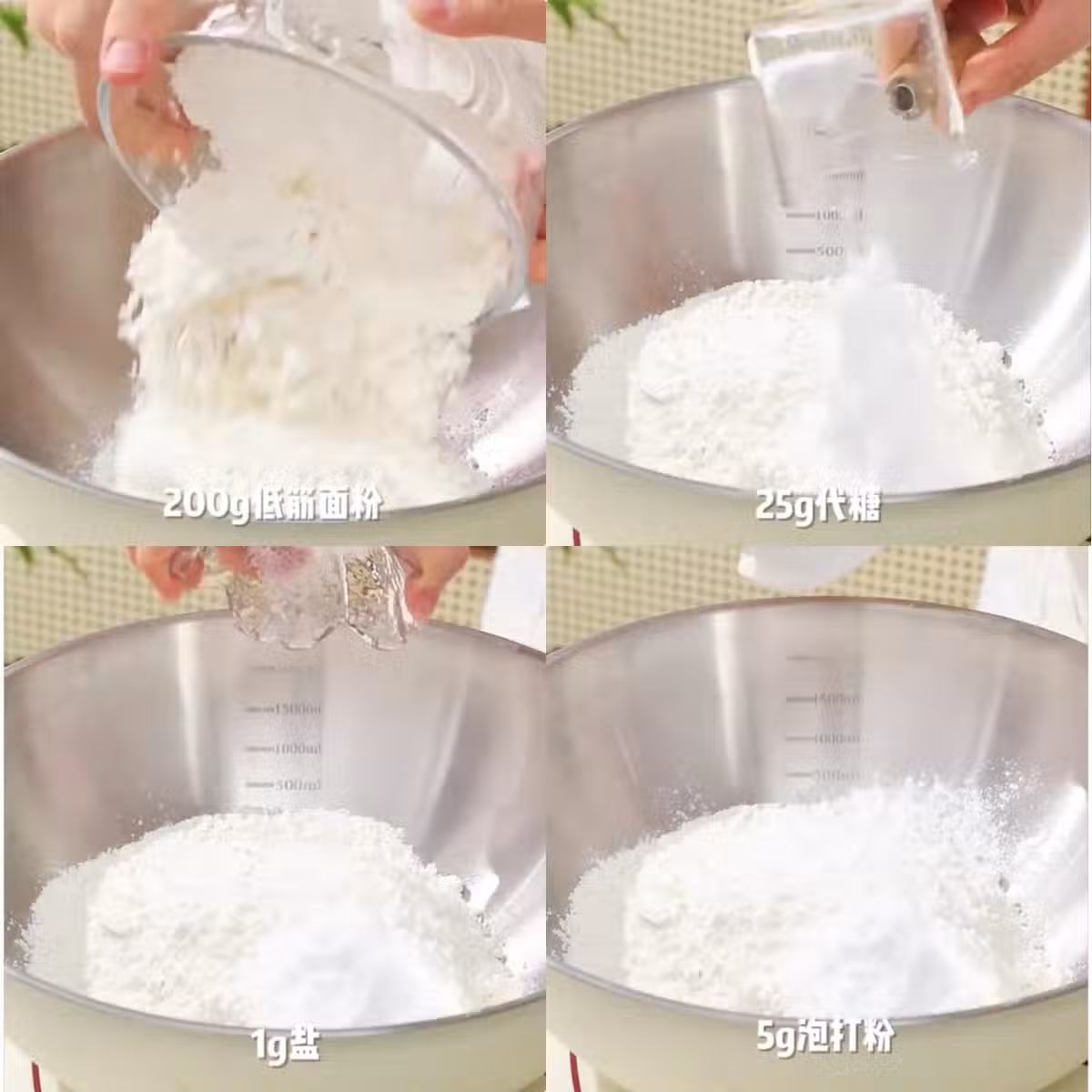 200g low-gluten flour, 25g sugar substitute, 1g salt, 5g baking powder, mix these powders evenly.