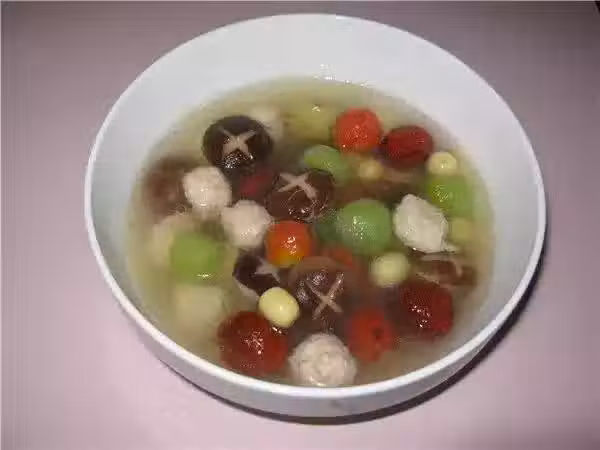 2、半鍋清水燒開(要是用素高湯更好),放入香菇、當歸頭、蓮子、生薑、紅棗、胡椒麵、素雞肉丸,小火慢燉,一小時,快起鍋前加入萵筍、胡蘿蔔,燉熟加點鹽,就做好了。