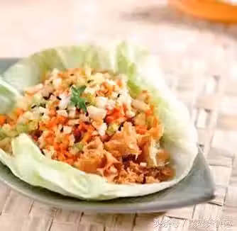 4、在剪好的萵苣里放上油條丁