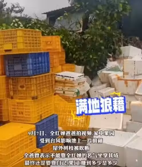 全紅嬋的爸爸分享家中果園被摧毀後的場景,屋內屋外一片狼藉,並且擺在院子內的果盒也全都已經被颱風吹倒。