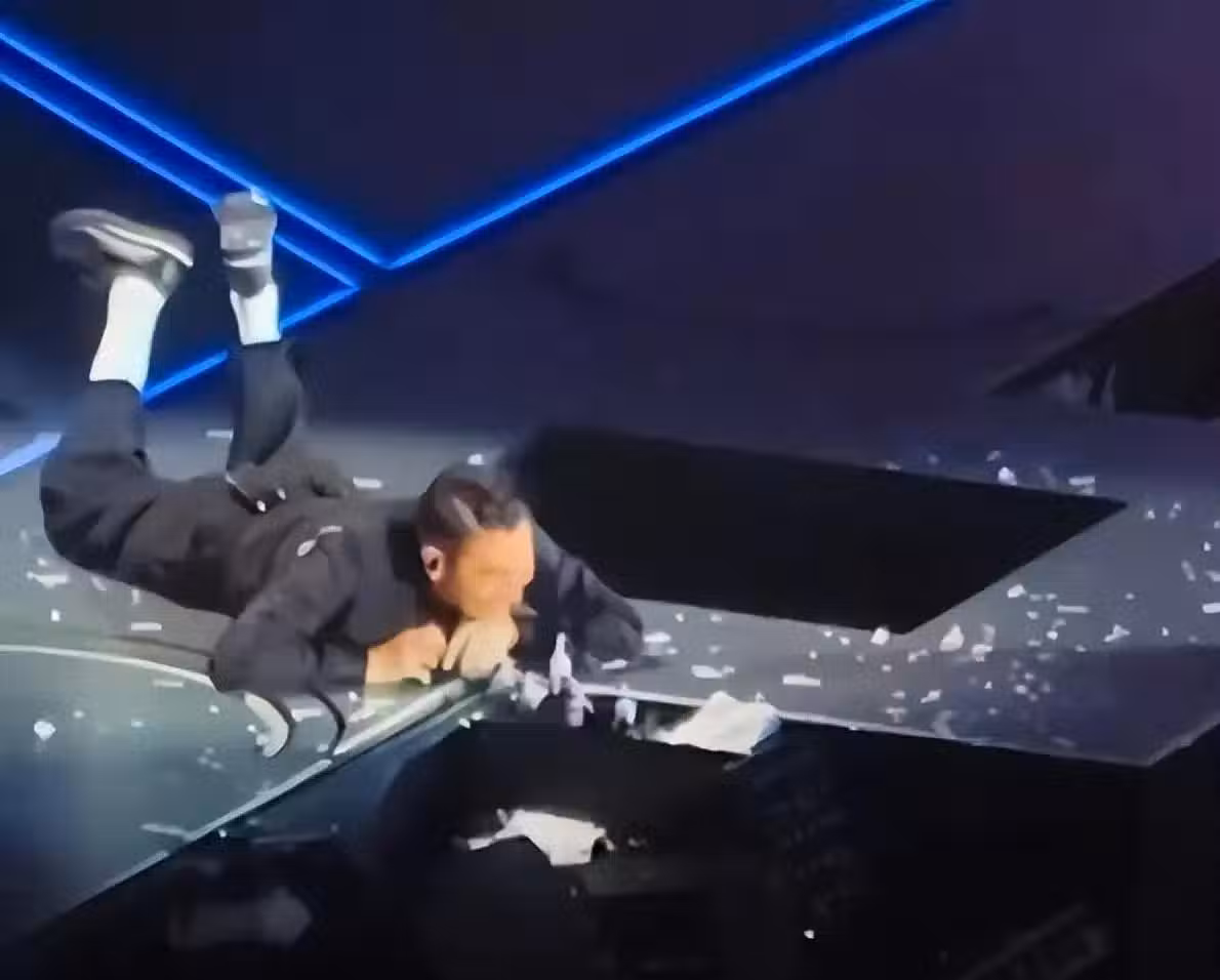 劉德華因為唱歌太投入,竟然忘記了舞台的邊緣地上有舞台升降機關給留下的方形洞。正好華仔經過方形洞邊上,結果一不小心一隻腳踩空,他整個人突然失足摔倒。