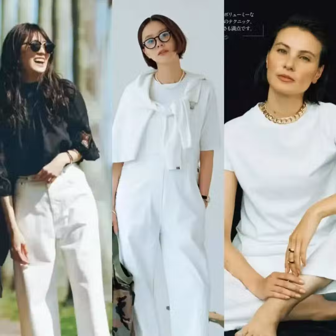 比如下面這幾組穿搭,採取短上衣和白色長褲搭配的時候,就能讓女性的腿部長度延伸到一個令人滿意的地步,從縱向使身材進行拉長,就會讓女性的狀態和身材比例看起來更好。