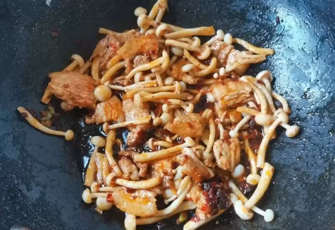 6.下入白玉菇翻炒均勻。