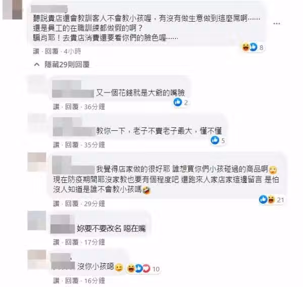 實際到三明治店的臉書查看,有不少親友團留言嗆聲「你們好秋喔,還會教訓消費者的小孩」、「聽說貴店還會教訓客人不會教小孩喔,有沒有做生意做到這麼扯啊」等等話語,且一搭一唱,洗了許多留言。