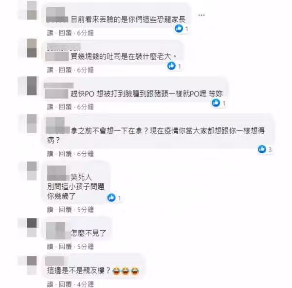 根據網友觀察,這些人並不是高雄當地人,幫忙嗆聲的好友們在臉書中也沒人居住在高雄市。網友看完更憤怒了:「幹嘛,還要抹黑高雄人?」、「捏完要怎麼吃?噁心死了」、「怎麼好意思發出來讓網友幫忙的呀」、「小孩子不懂事,家長也不懂事?不要丟人了回家吧」、「我兒子也會捏麵包,我都有好好教育,有時候沒注意到他已經捏變形了,我就只好買回去。難道這不是正常做法?」