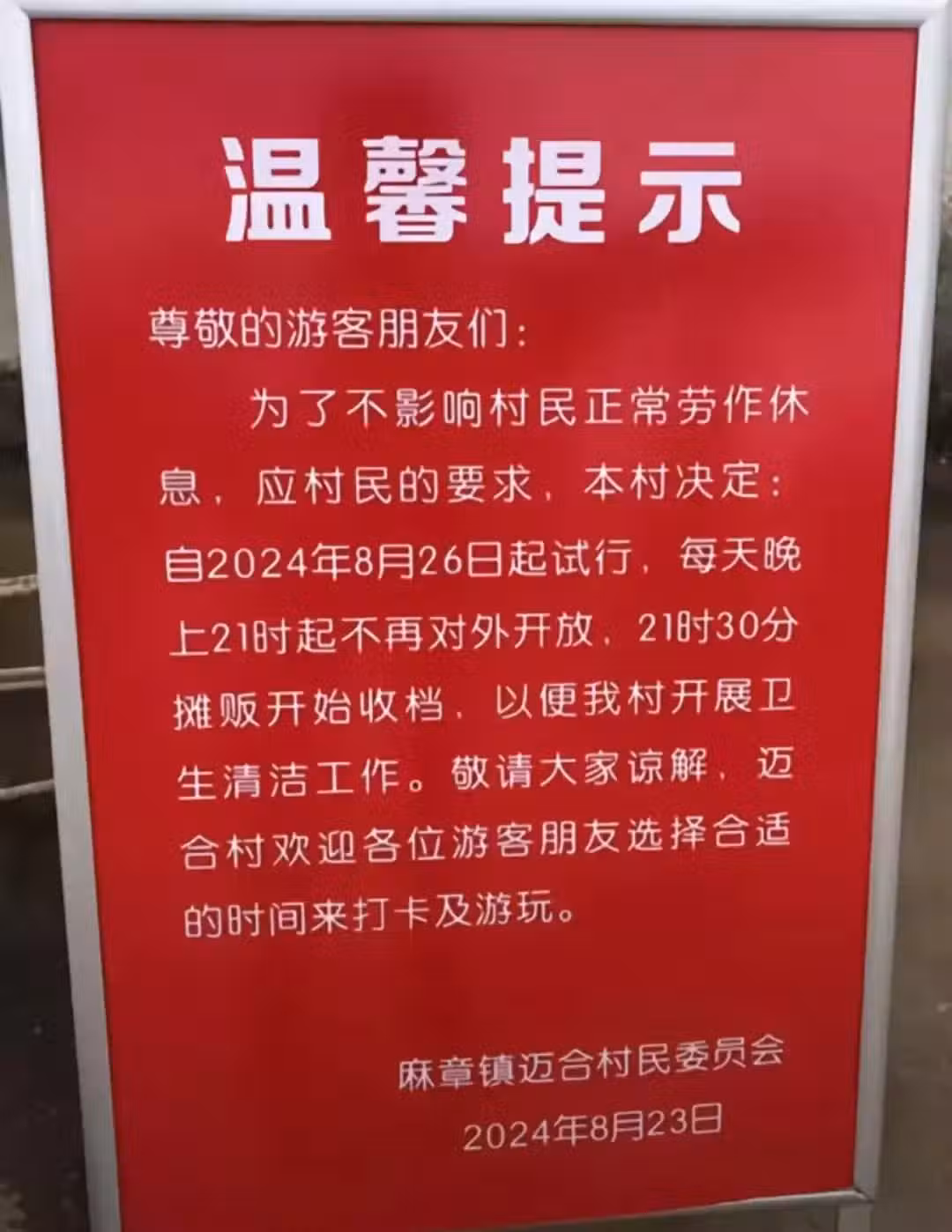 為什麼自8月26日起村子晚9點後不對外開放?該村幹部解釋稱因為要開學了,在小學旁邊住的人比較多,村裡又有比較多做農活的老人,弄太晚了會對村民休息有影響,所以建議晚上9點之後大家就不用再來村裡遊玩。商家確實擺攤會受影響,但還是考慮到大家的正常生活。