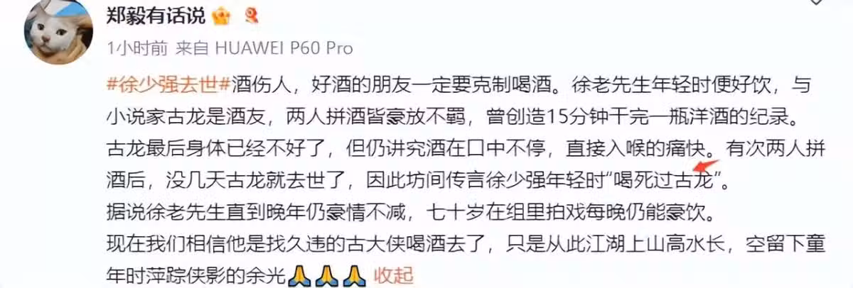 文中,他表示「徐老先生年輕時便好飲,與小說家古龍是酒友,兩人拼酒皆豪放不羈,曾創造15分鐘幹完一瓶洋酒紀錄,有次兩人拼酒後,沒幾天古龍就去世了」,坊間盛傳徐少強「喝死過古龍」。