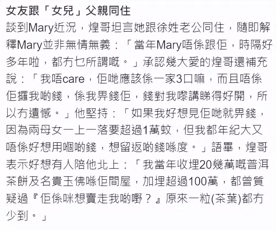秦煌這次採訪又算了一筆帳,說先後給內地情人花了一百萬,要不是心疼1萬的車旅費,他會讓情人來香港看他。