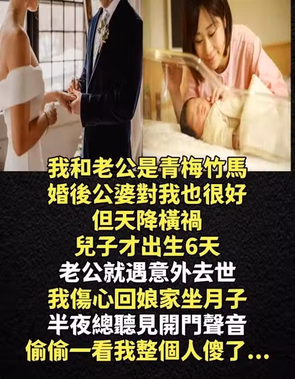 我和老公是青梅竹馬,婚後公婆對我也很好。但天降橫禍,兒子才出生6天「老公就遇意外去世」! 我傷心回娘家坐月子,半夜總聽見「開門聲音」偷偷一看我整個人傻了...