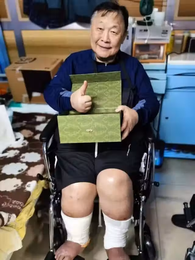 秦煌在護老院的活動空間並不大,一間屋裡有多個床位,靠著帘子隔開,勉強能夠有自己的私密空間,當天探望秦煌的時候,他正坐在輪椅上,穿著深色上衣和短褲,兩個小腿上都纏著紗布,看起來腫腫的,其中一隻腳還發黑,不知道是什麼炎症引起的。