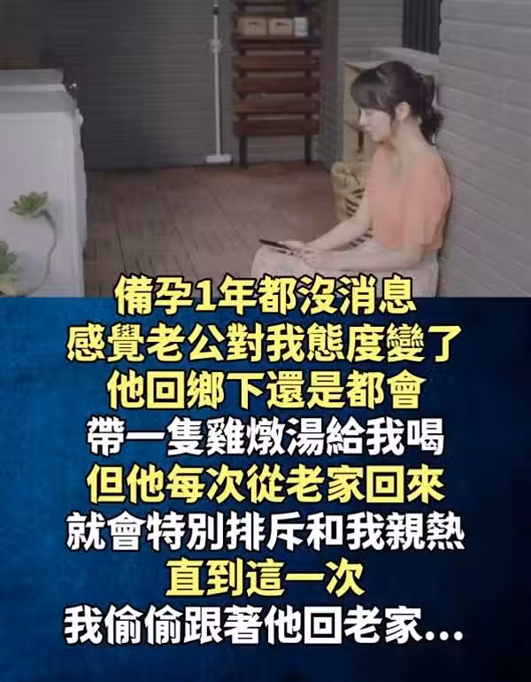 備孕1年都沒消息,感覺老公對我態度變了...他回鄉下還是都會帶一隻雞燉湯給我喝,但他每次從老家回來就會特別排斥和我親熱,直到這一次我偷偷跟著他回老家...