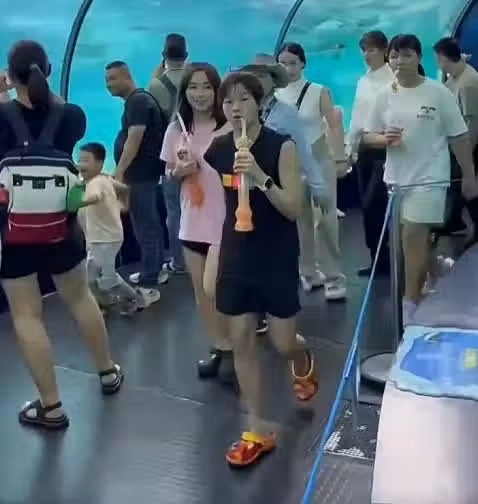當她回家到動物園遊玩的時候,嬋寶也是手拿汽水飲料開心暢喝。