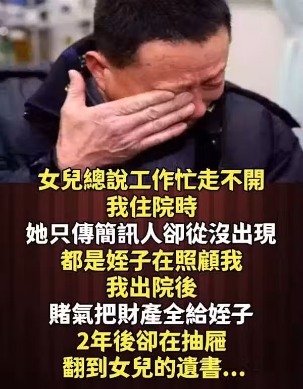 女兒總說工作忙走不開! 我住院時「她只傳簡訊人卻從沒出現」都是侄子在照顧我,我出院後「賭氣把財產全給侄子」 2年後卻在抽屜翻到女兒的遺書~😨