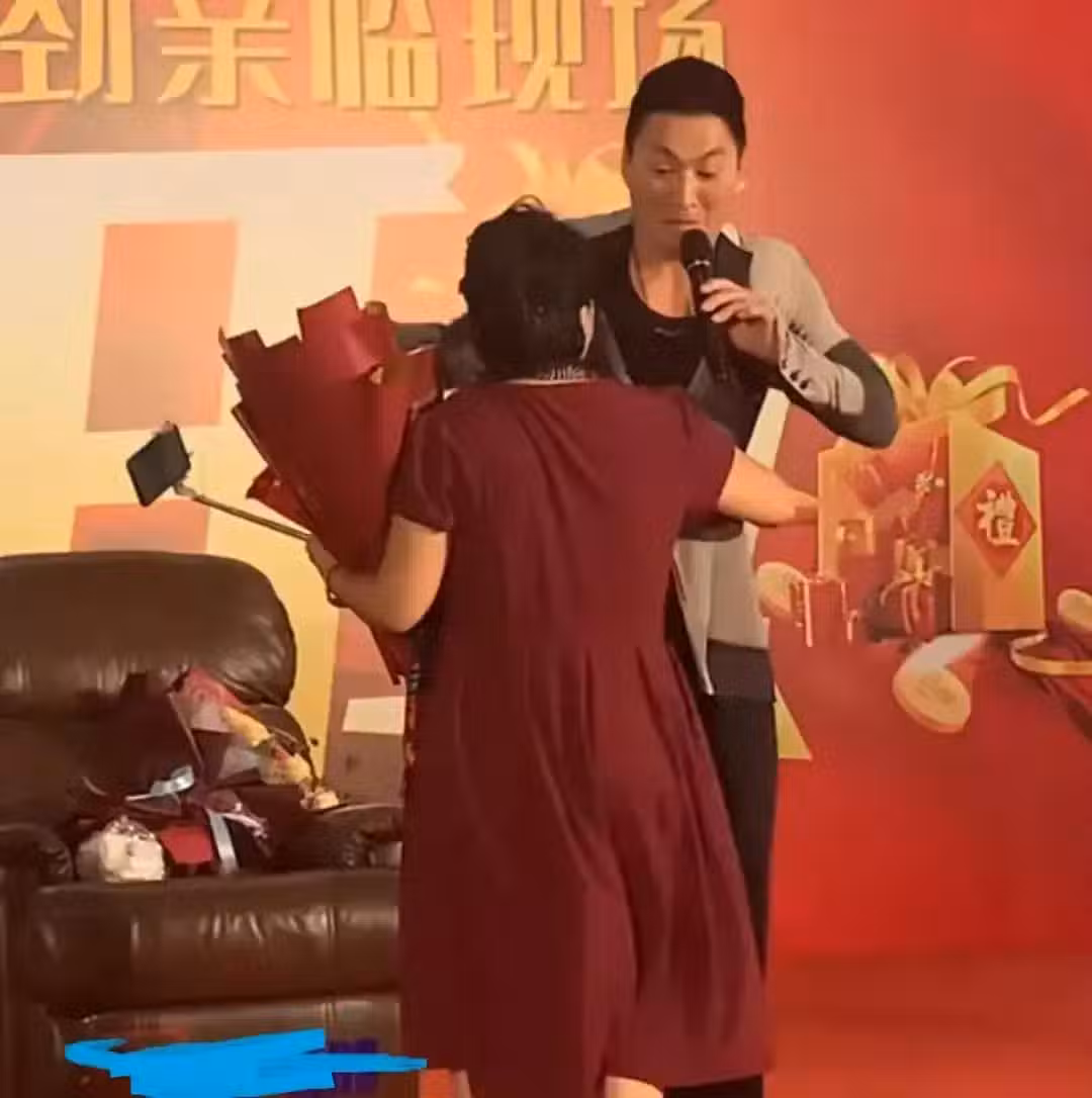 何家勁唱到一半,看到有人上來送花,他就把前一束花放到沙發上,站起來準備迎接。來者是一位富態十足的大媽,她花還沒送出,就單手抱住何家勁了。何家勁頗感意外,下意識想躲,但馬上調整,虛抱了她,拍一拍她的肩膀。